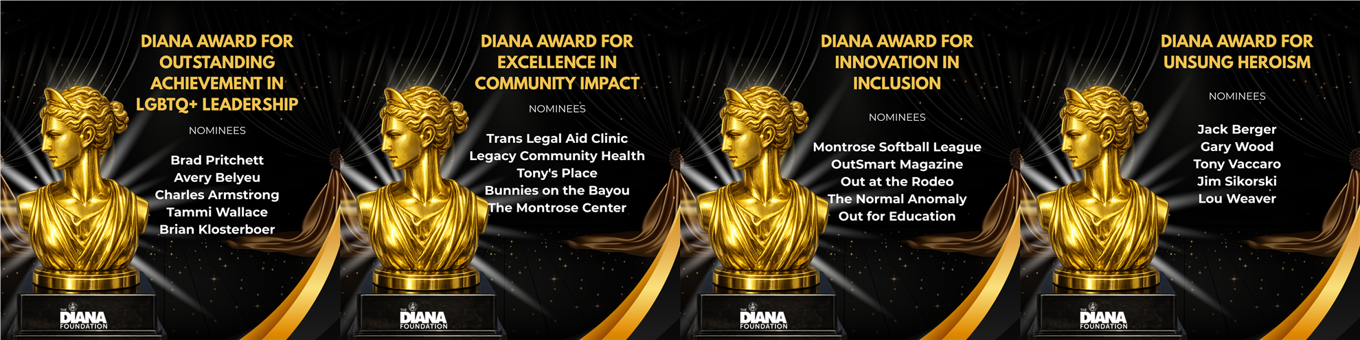 As America’s oldest active LGBTQ+ organization, The Diana Foundation continues to honor its rich history of humor and heart. The 73rd Awards will feature our beloved “Academy of Motion Picture Arts and Antics” with four of our signature roast-style honors — Best Picture, Best Actress, Best Supporting Actress, and Best Director — alongside four all-new community awards recognizing real-world excellence in leadership, innovation, and impact across Houston’s LGBTQ+ community.